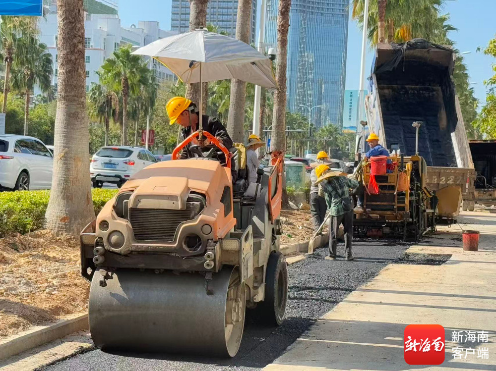 1月5日,三亚迎宾路,施行工程人员对供水管网改造竣工路段进行沥青摊铺作业。记者 胡丽齐 摄
